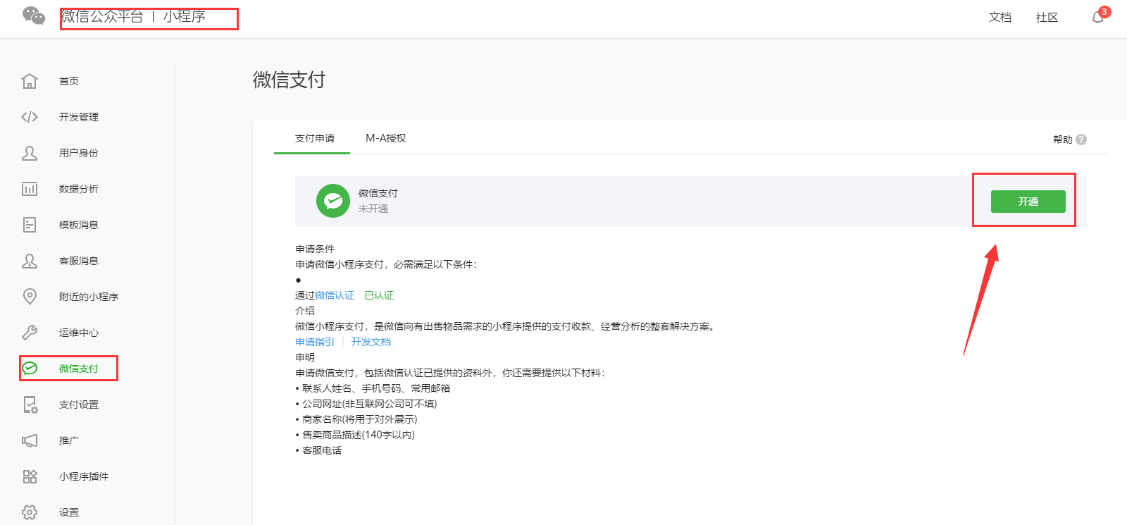 1、登录微信小程序账户下-点击微信支付(需先微信认证)-点击开通